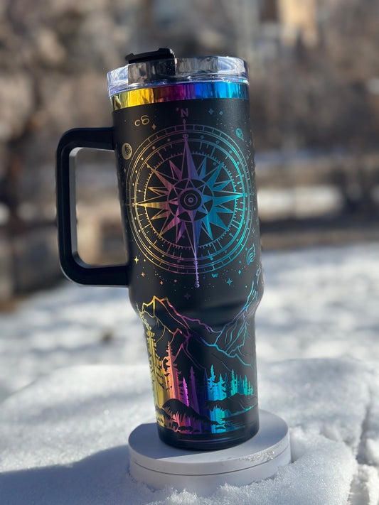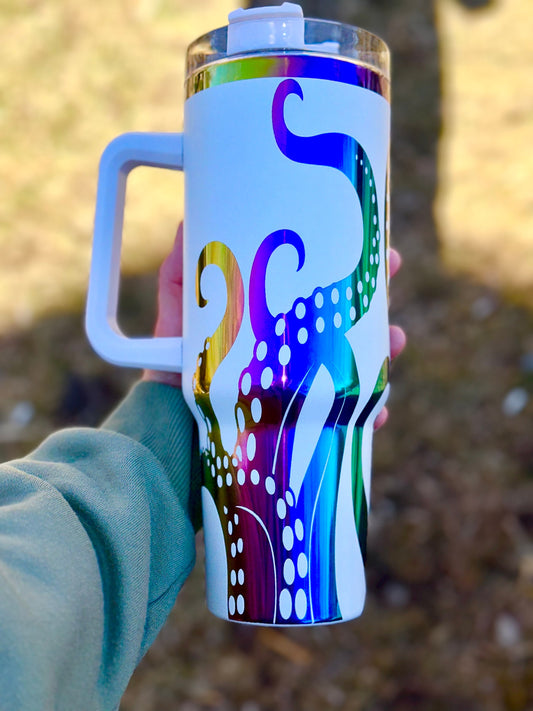 Octopus Tumbler with Handle, Laser Engraved 40oz Black and Rainbow/Aurora