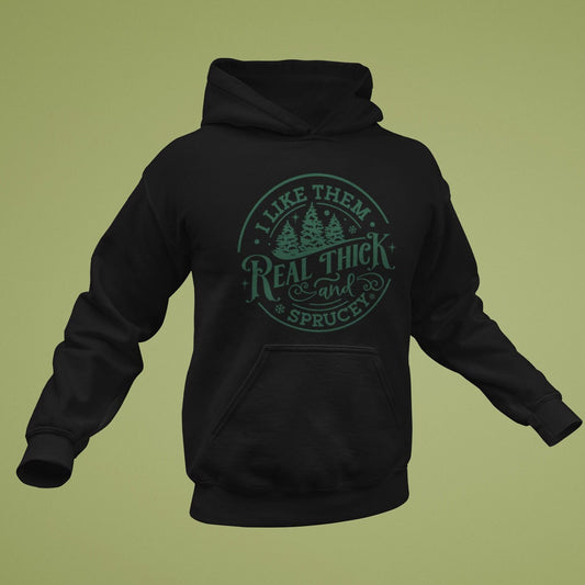 I Like Them Real Thick and Sprucy, Unisex Christmas Hoodie, Funny 90s Throwback, Adult Tee