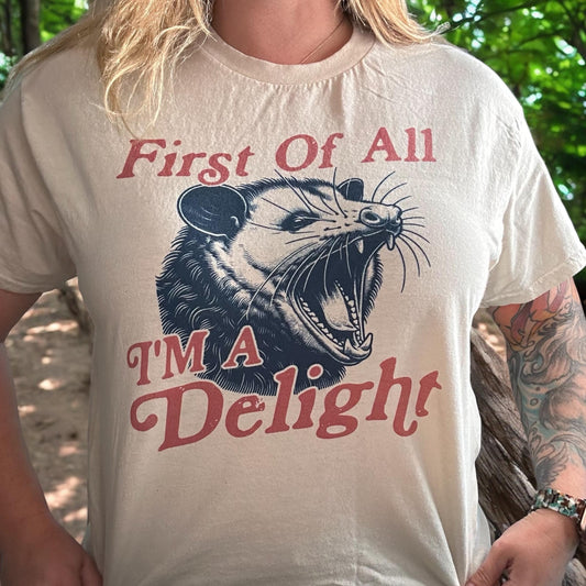 First of All, I’m a Delight, Sarcastic Funny Adult Tee, Opposum Printed Shirt
