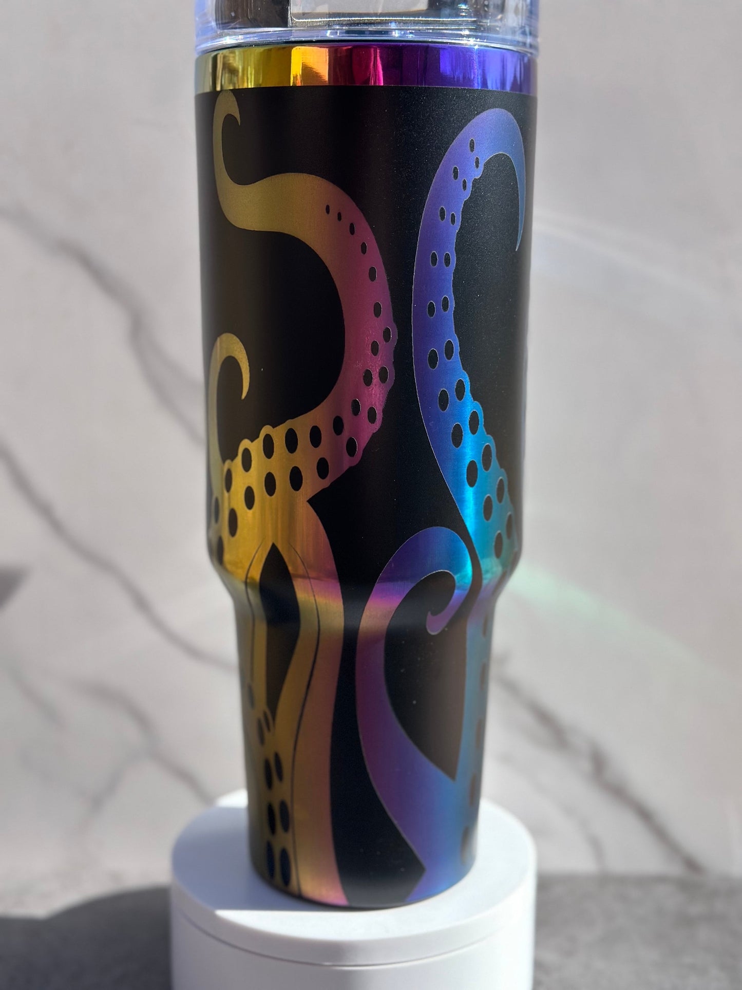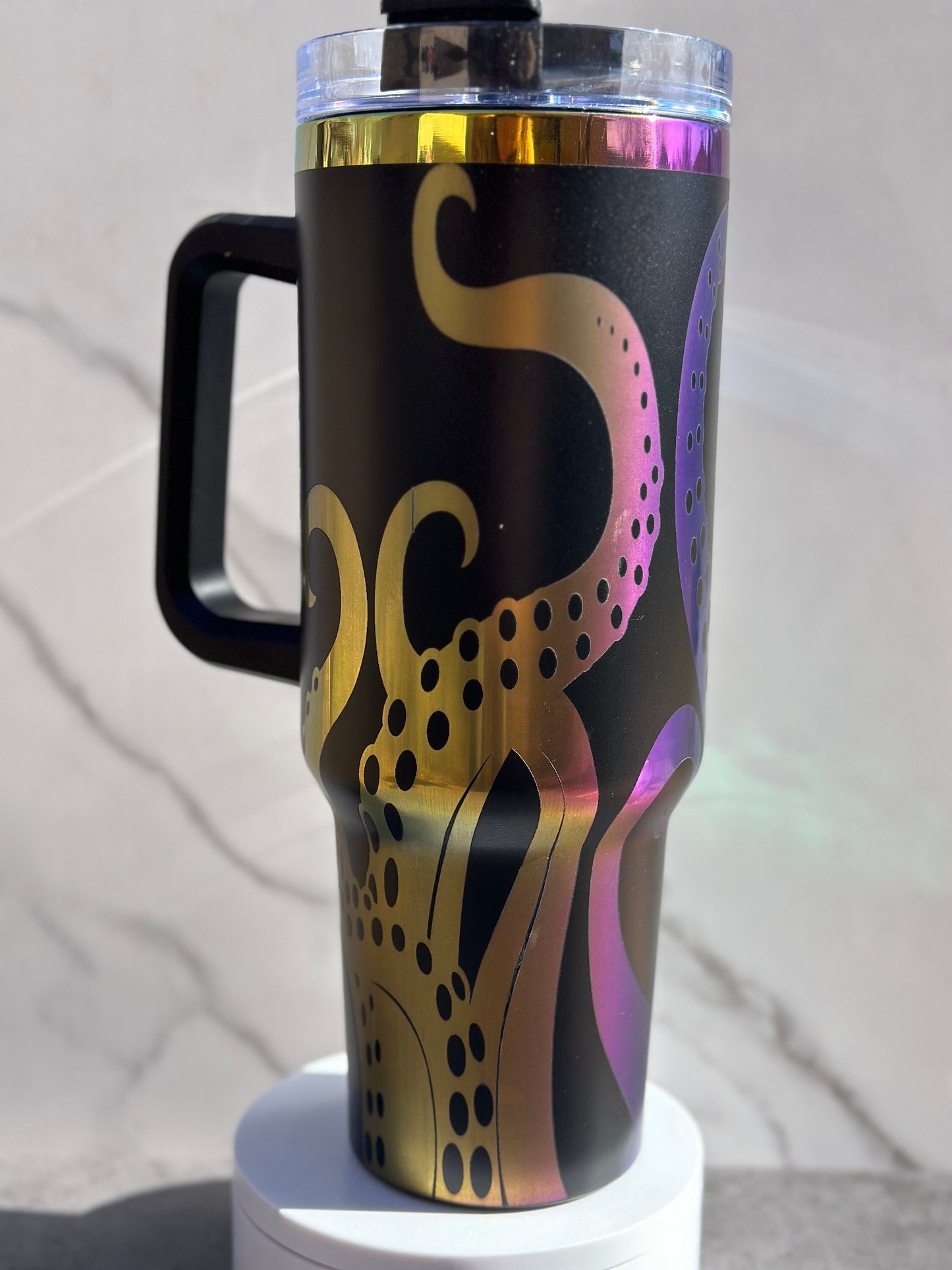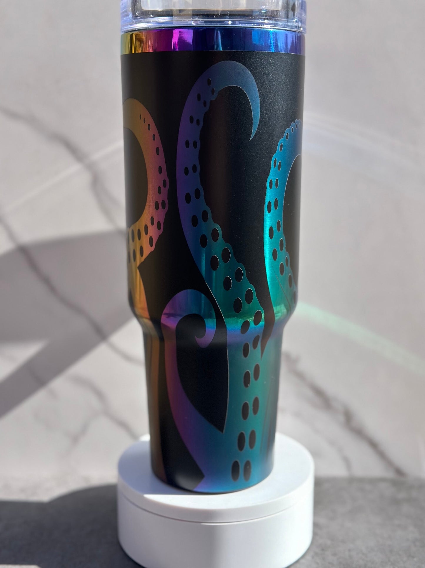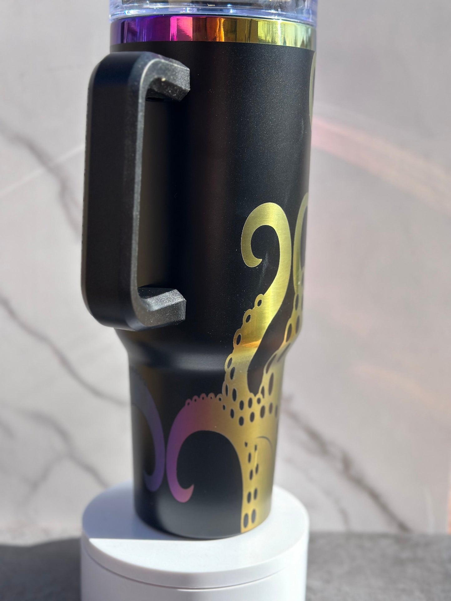 Ocean themed Octopus Tumbler with Handle, Laser Engraved 40oz Black and Rainbow/Aurora
