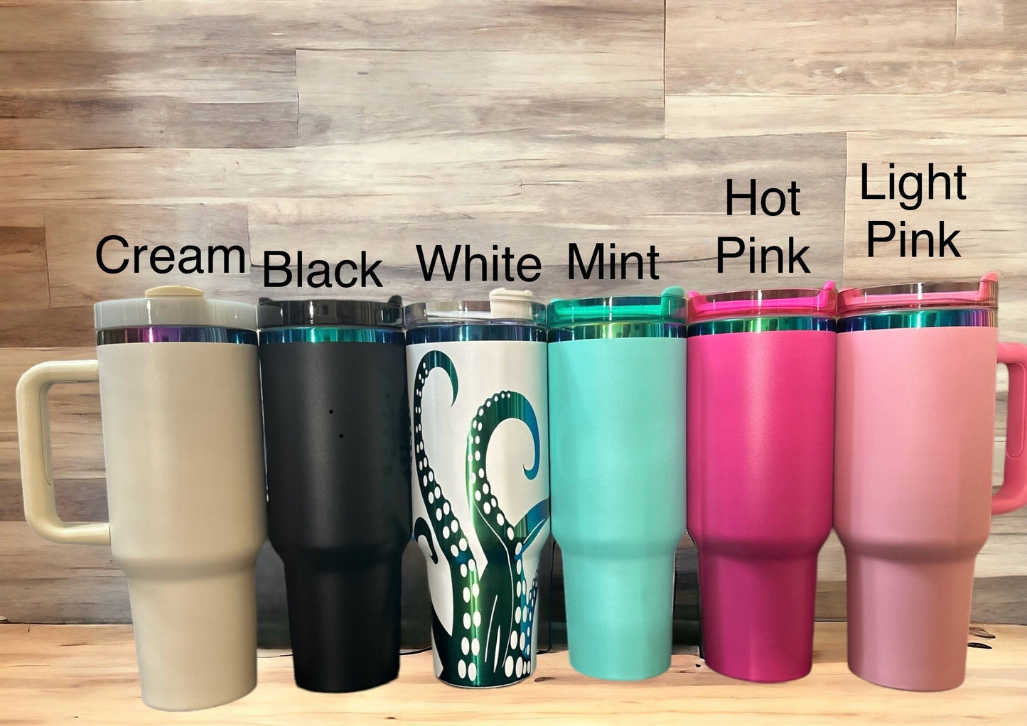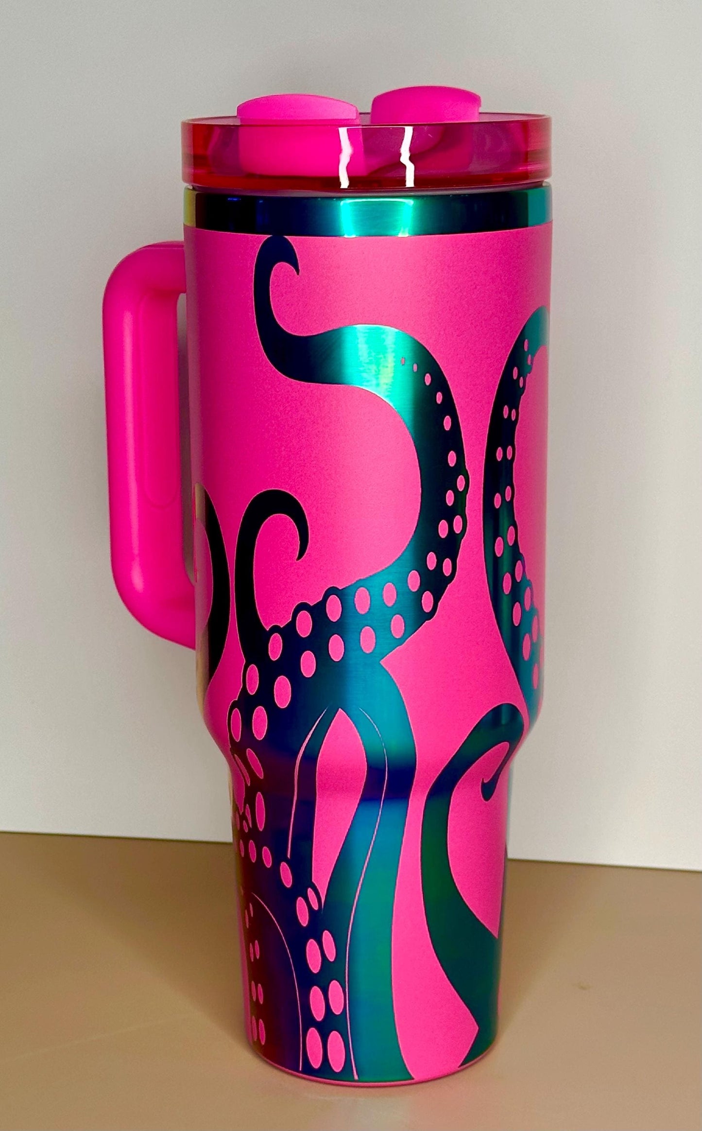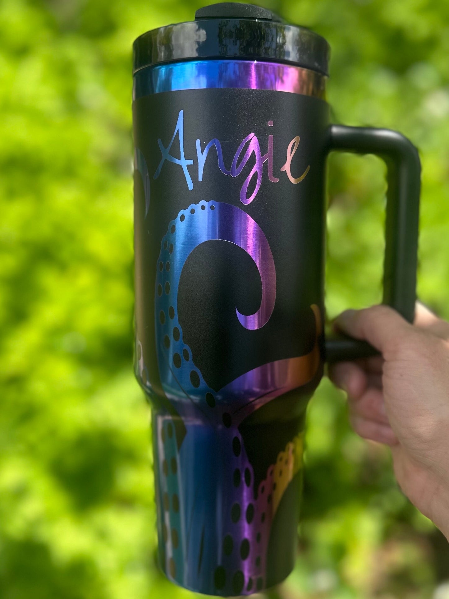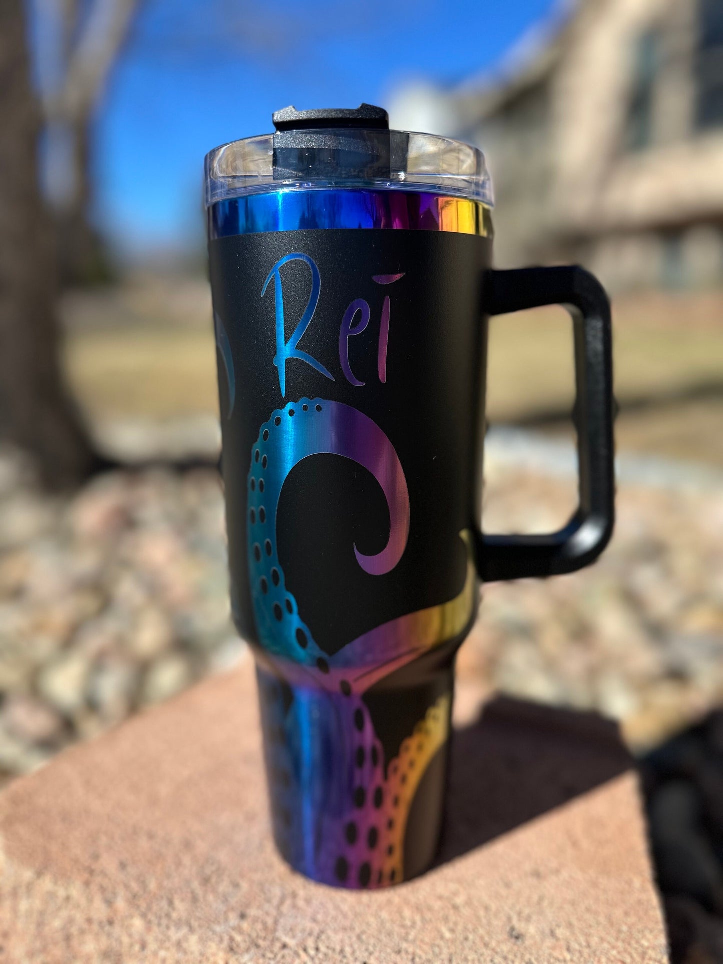 Ocean themed Octopus Tumbler with Handle, Laser Engraved 40oz Black and Rainbow/Aurora