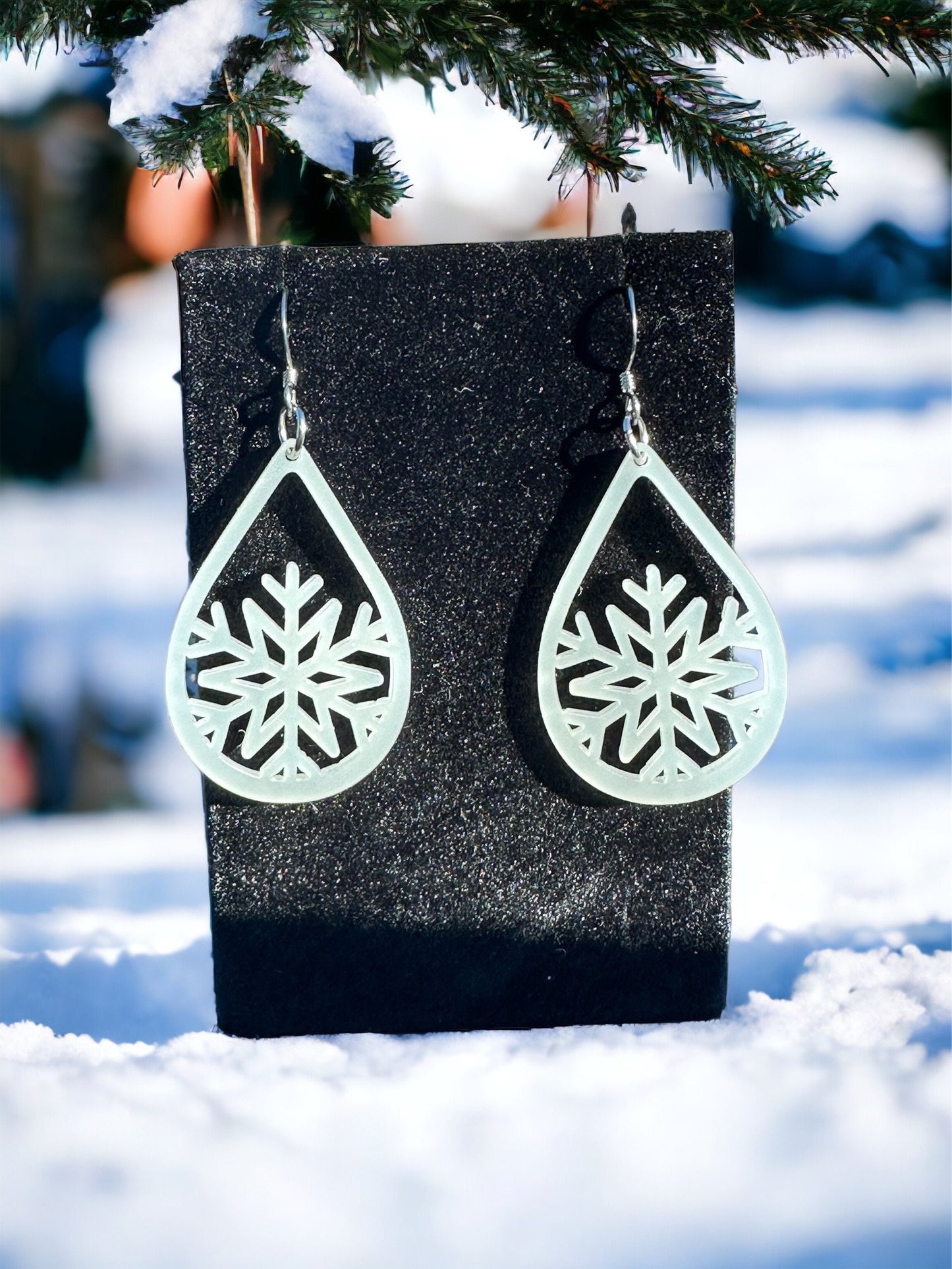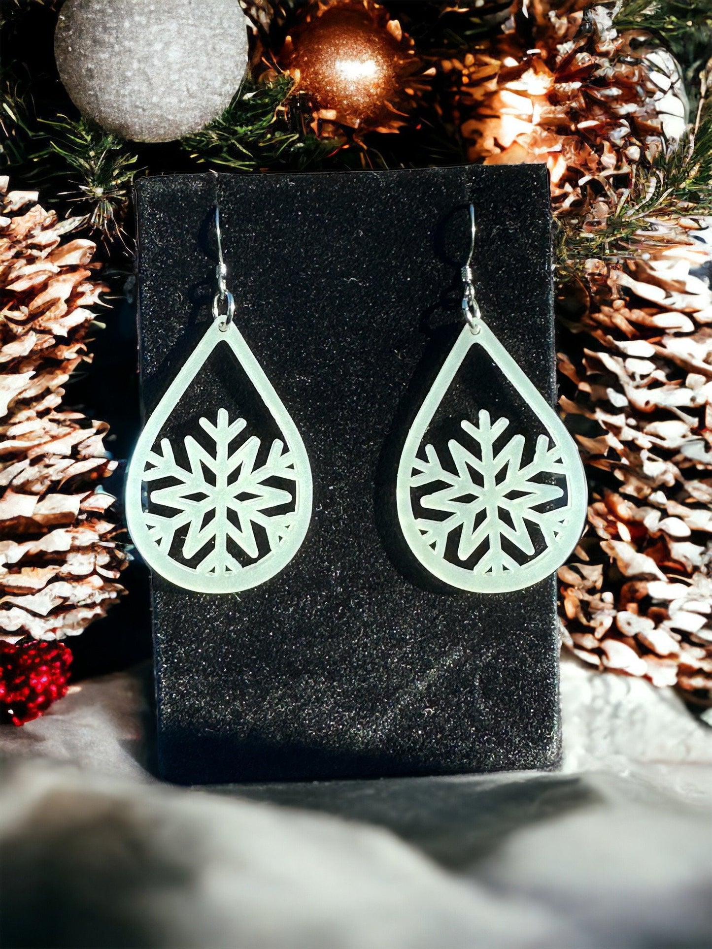 Beautiful acrylic Snowflake Earrings handmade to perfection! These will make a perfect stocking stuffer or gift for any Christmas and winter lover! Made with hypoallergenic stainless steel hardware. Approximately 1” wide and 2” in length not including the hardware.